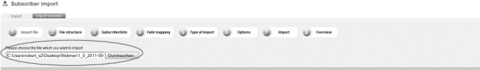 Save the file as a file with the feature 'CSV (Comma delimited)'. Apple user: If you own an apple computer, you will have to safe the file as 'CSV-Windows'. CPN does not run files in the Mac format. Step 1 – Import fileOn the navigation bar click on 'Subscribers' and then go to the navigation subitem 'Import'. This is the way how you get to the menu-guided import function of CPN. First, you will have to choose the file which you want to import; |