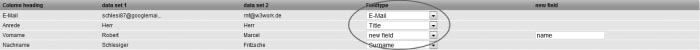 if the first line of your address file contains (as shown in the example above) the column headings, leave the item 'First line contains column headings' marked . Otherwise, if your address file starts right away with the subscriber data, unmark this option. Step 3 – Subscriber ListsChoose the subscriber list to which you want to import the addresses. Subsequently click on 'Next'. Step 4 – Field MappingNow you are asked to match the field names of your subscriber data with those of CPN. In order to do so, please choose in the drop down menus the associations which correspond to field information displayed to the left of these menus. If there does not exist a matching subscriber field, choose 'New Field' and enter a name for the subscriber field that needs to be created. Click 'Next'.