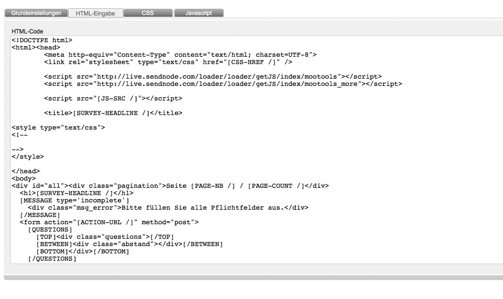 Insert your entire html source code. By creating a new template, CPN generates a sample html source code with all important survey-placeholders automatically in this tab.