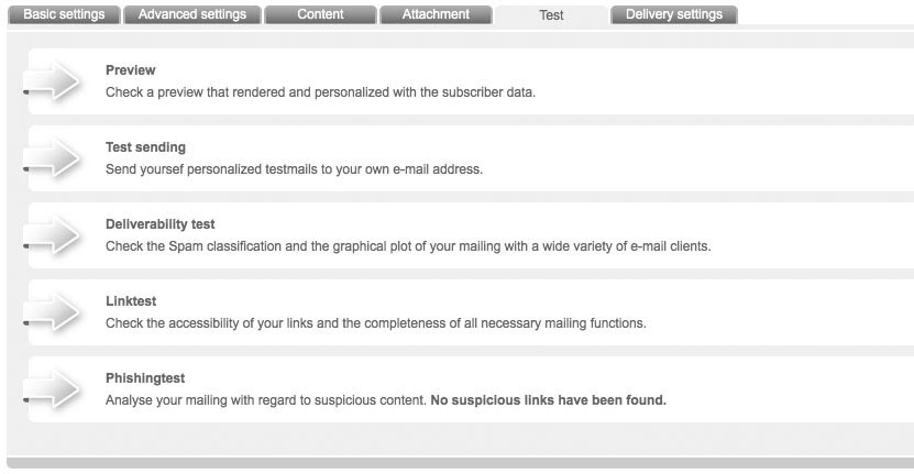 Having finished your newsletter, CPN offers you numerous testing possibilities. This helps you to optimize your mailing and achieve maximum success before actual dispatch. You can get to the testing functions by choosing the tab 'Test' in the menu in which you edit your mailing. Following tests are available: |