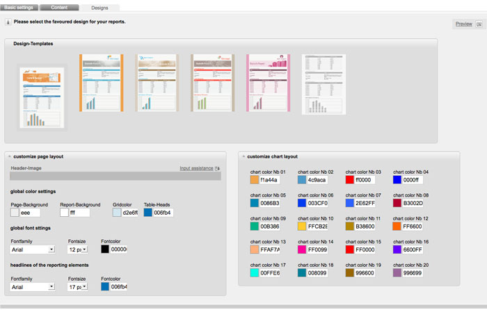Now you also can adjust the design of your report. Choose the tab 'designs'. By default CPN suggests you six different layouts. HTML experts can also open the 'advanced settings' below the layouts to edit the html-code. For example you can insert your logo in th header.