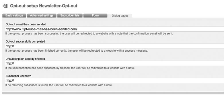 Enter a name and an optional description. Choose the 'mode' (important). The following modes are supported by 'CPN': Double-optout with confirmation e-mail: after unsubscribe from your website or your newsletter a confirmation email will be send automatically. Optout will be activated after clicking the confirmation link in this email. After successful unsubscription the former subscriber will get a last email („You unsubscribed successfully of our newsletter.“) Double Optout: Like described before, but without sending of a „successful unsubscription“ e-mail Confirmed Opt-Out (recommended): After unsubsubscription on your website or in your newsletter a „successful unsubscription“ email will be sended immediately. Single Optout: No e-mails will be send. There just will be a message in your browser, that optout was successfull. In Tab 'advanced settings' you can deposit your e-mail address in field 'e-mail forwarding', to be informed about unsubscriptions. Tab 'subscriberlists': Choose your favorite subscriberlist(s), where all unsubscriptions should be logged out. Select the subscriberfields, which should be filled out by your subscribers in tab 'Form'. After clicking 'create form fields' a popup appears, where you can choose and add subscriber fields to your form. Click 'sort formular fields' to arrange your fields. Click 'test form' to open a new tab in your browser with a preview of your form. Source Code of your website is genereated by 'CPN' by clicking 'Formular soruce code'. A popup appears with your source code. Last tab: Dialog pages |