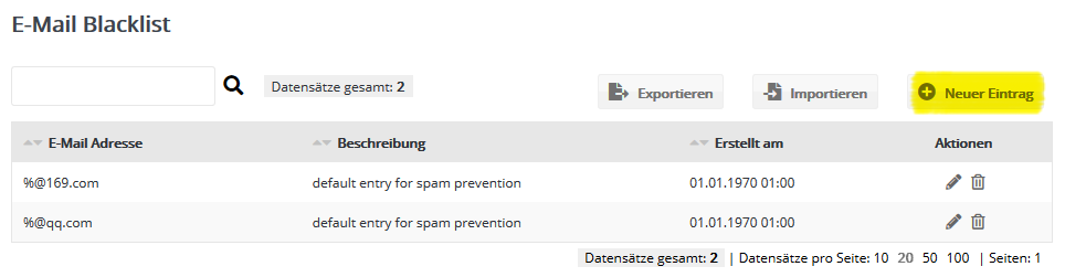 Die E-Mail-Blacklist ist der einfachste Weg, E-Mail-Adressen oder gesamte Domains vom Empfang aller Mailings auszuschließen. Beispiele: